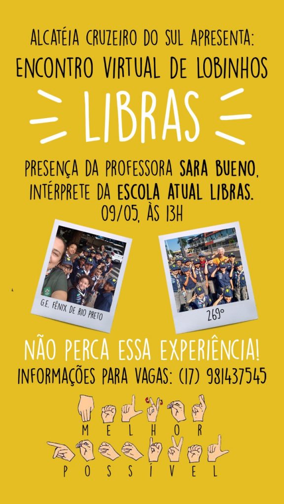 Neste sábado, dia 9 de maio, às 13h, a alcateia Cruzeiro do Sul do Grupo Escoteiro Fênix de Rio Preto 269/SP irá promover um Encontro Virtual de Lobinhos, com o tema “Libras”. O encontro será aberto para outras alcateias que quiserem participar e terá a presença da professora Sara Bueno, intérprete da Escola Atual Libras.