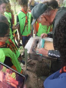 Um dos grandes destaques foi a vivência no Meliponário Guardião da Natureza, conduzida pelo criador licenciado Sr. Fernando Marra. Os jovens conheceram 266 caixas de abelhas sem ferrão, representando 16 espécies brasileiras diferentes, participaram de uma atividade prática sobre meliponicultura e fizeram uma degustação de mel. Essa experiência reforçou a importância da preservação ambiental e da biodiversidade.
