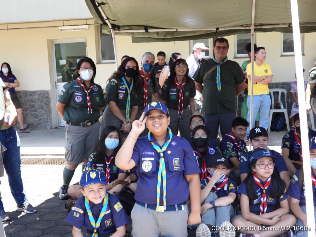 Os jovens de lobinho a pioneiro, acompanhados de escotistas e pais, puderam acompanhar a cerimônia de hasteamento da bandeira, que ocorreu ao meio dia.
