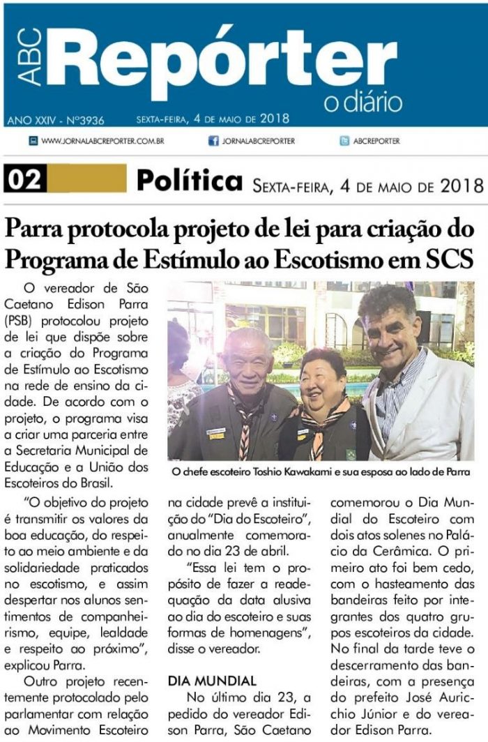O vereador de São Caetano Edison Parra (PSB) protocolou projeto de lei que dispõe sobre a criação do Programa de Estímulo ao Escotismo na rede de ensino da cidade. De acordo com o projeto, o programa visa a criar uma parceria entre a Secretaria Municipal de Educação e a União dos Escoteiros do Brasil.