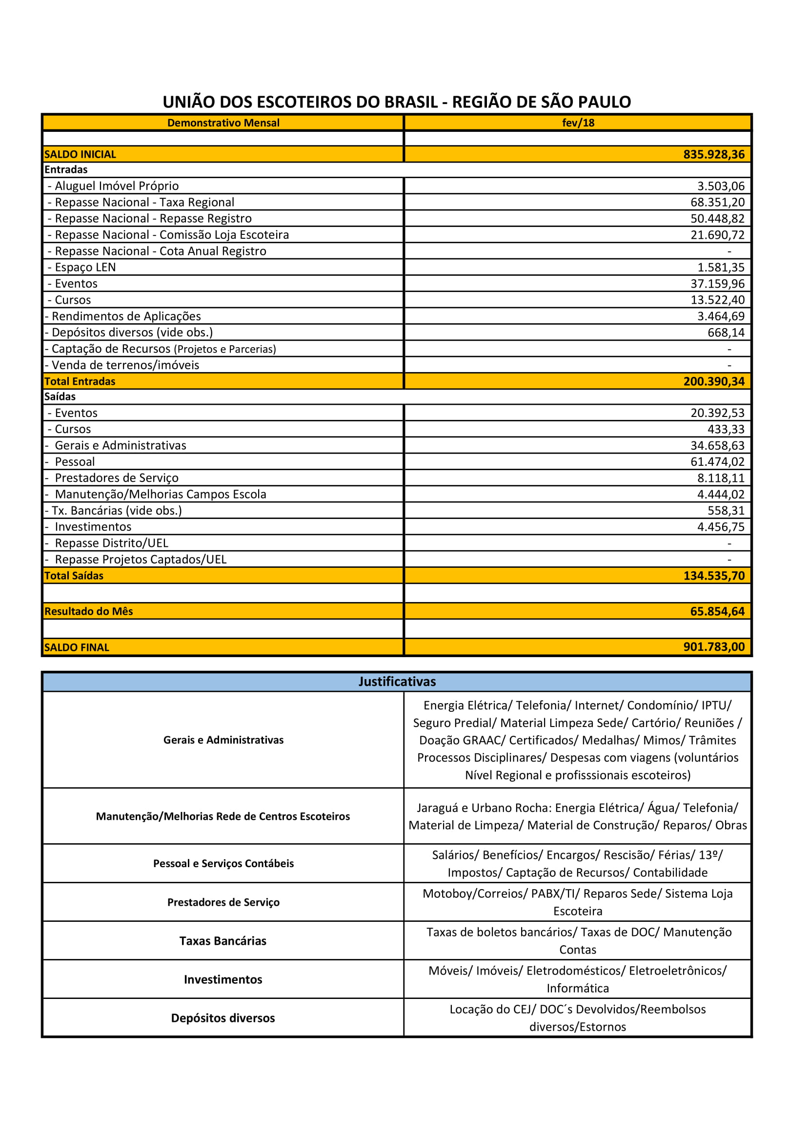 Confira o Demonstrativo Financeiro da Região Escoteira de São Paulo do período de fevereiro.