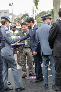 No Palanque de honra do desfile estiveram representando a região escoteira de São Paulo, Rodrigo Ramos de Freitas (diretor-presidente) e Lucas Jun Sakajiri (Diretor Financeiro), que neste ano foi agraciado com a Medalha Constitucionalista, concedida pela Sociedade Veteranos de 32 – MMDC. “Muito feliz por receber esta honraria tão representativa para o estado de São Paulo e para a democracia. Saio com a motivação reforçada e aproveito a ocasião para destacar a importância de reconhecer os nossos voluntários, utilizando as várias formas de reconhecimento disponíveis”, declara Lucas Jun.