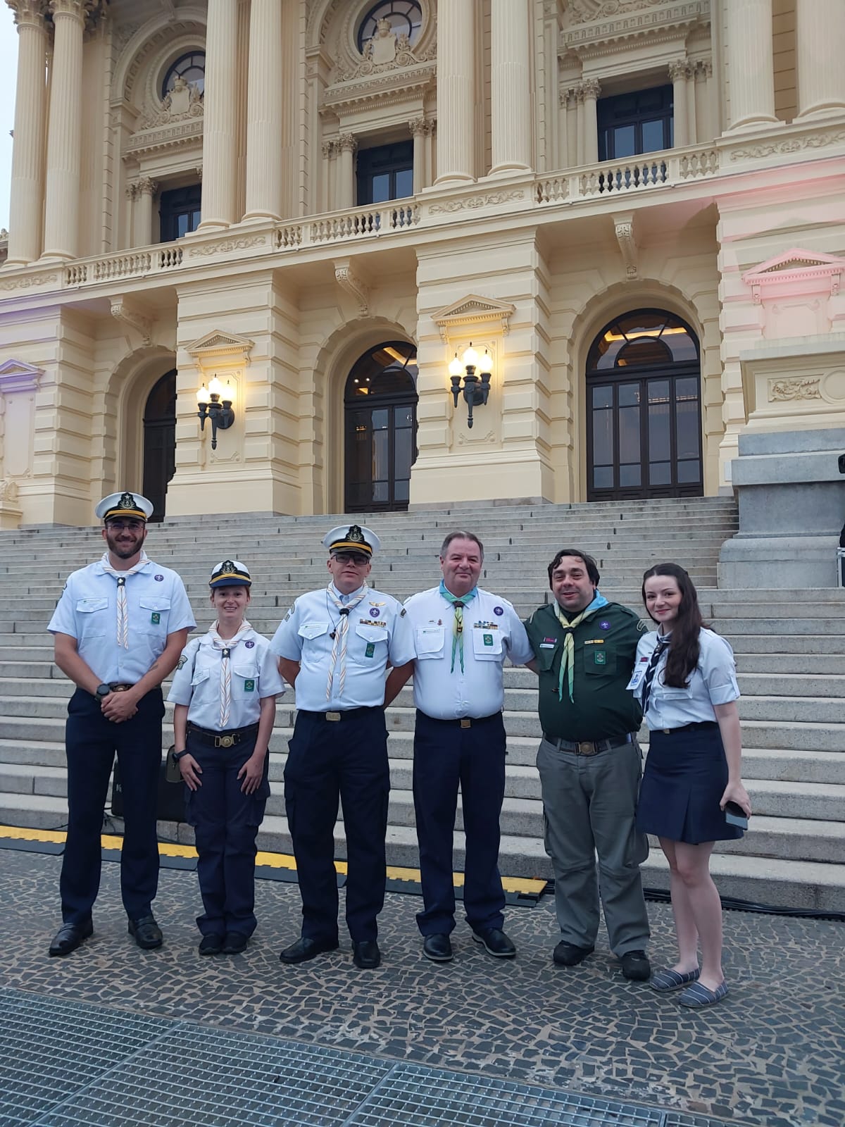 Na foto:Escotistas e Dirigentes do Grupo Escoteiro do Mar Velho Lobo – Edmundo Macha, Juliana Macha e Marcelo Nogueira Leite; Marco Antônio Bortoli, Coordenador Nacional da Modalidade do Mar; Rodrigo Ramos de Freitas, Diretor-Presidente dos Escoteiros do Brasil – São Paulo; e Marina Bortoli, pioneira do Grupo Escoteiro do Mar Ilha do Mel, do Paraná.