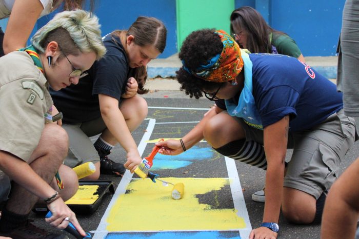 A pintura da área externa da escola foi a primeira atividade voluntária realizada em conjunto com todos os presentes no encontro. Com a ajuda de Bianca Benevides, do Grupo Escoteiro Raposo Tavares 254/SP, foram feitos rascunhos de brincadeiras de rua, como Amarelinha e a Toca do Coelho. Ao final do dia, três jogos infantis deram cor ao pátio da escola, que antes só tinha o cinza do asfalto como cenário.