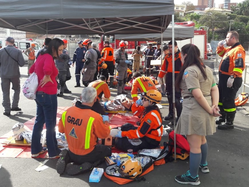 A representação simulou o atendimento a vítimas e o abandono do local, instruindo os participantes a procederem em situações-limite. “Todos elogiaram muito os nossos jovens! Pela dedicação, foco, agilidade e preparo demonstrados”, relatou Adolfo Mauro, coordenador regional de Ações Humanitárias. Parte dos reconhecimentos ao desempenho dos escoteiros veio de observadores internacionais, de países como Estados Unidos e Israel.