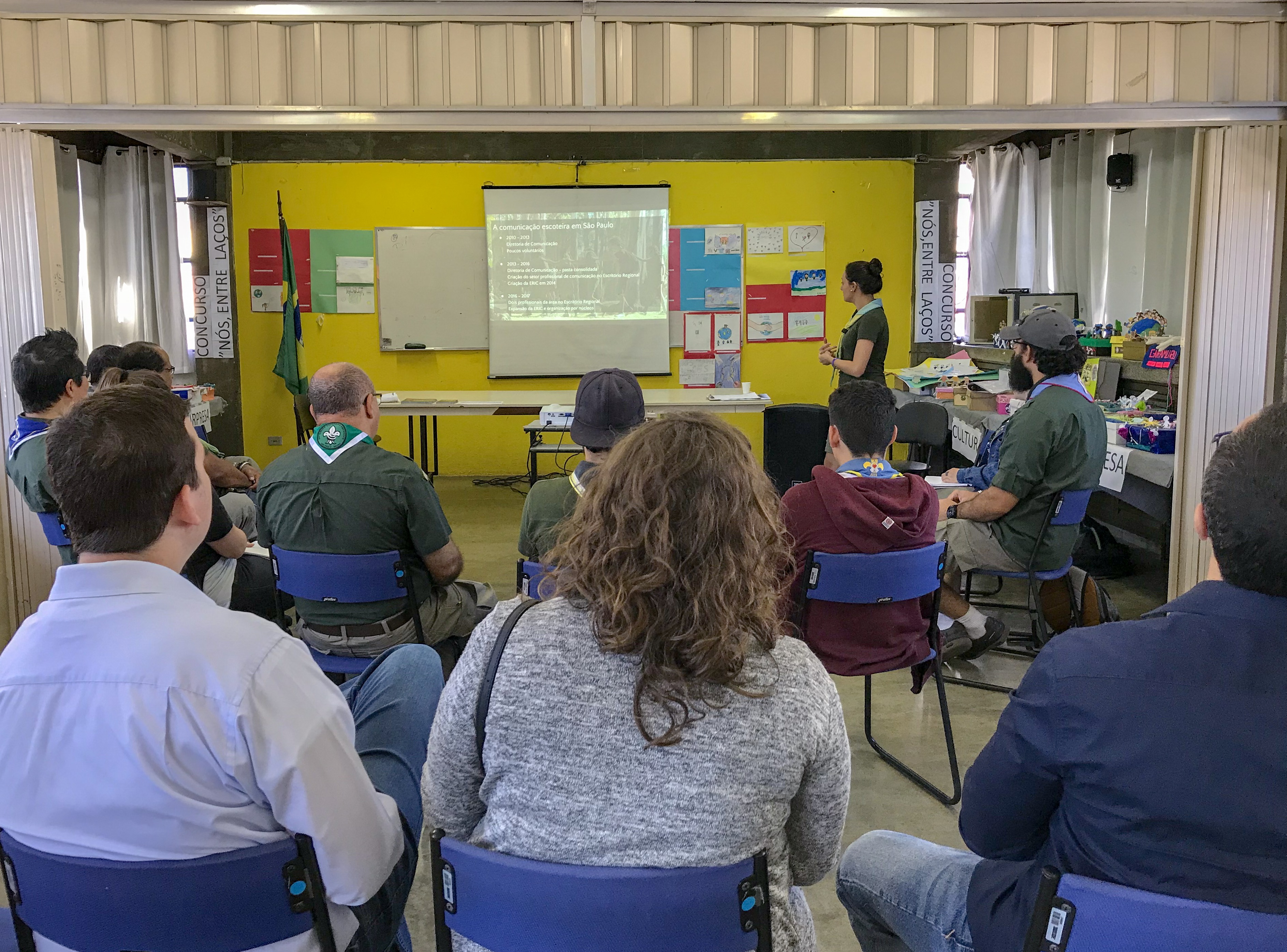 Escotistas e um jovem sênior de cidades como São José dos Campos, Campinas, Rio Grande da Serra e da capital estiveram reunidos no Encontro Regional de Comunicação Escoteira, realizado em 12 de novembro, na sede do Grupo Escoteiro Caramuru 26/SP, na capital paulista. Todos dedicaram o domingo visando enriquecer o conhecimento para aplicar as boas práticas em seus distritos, UELs (Unidades Escoteiras Locais) ou mesmo em suas seções.