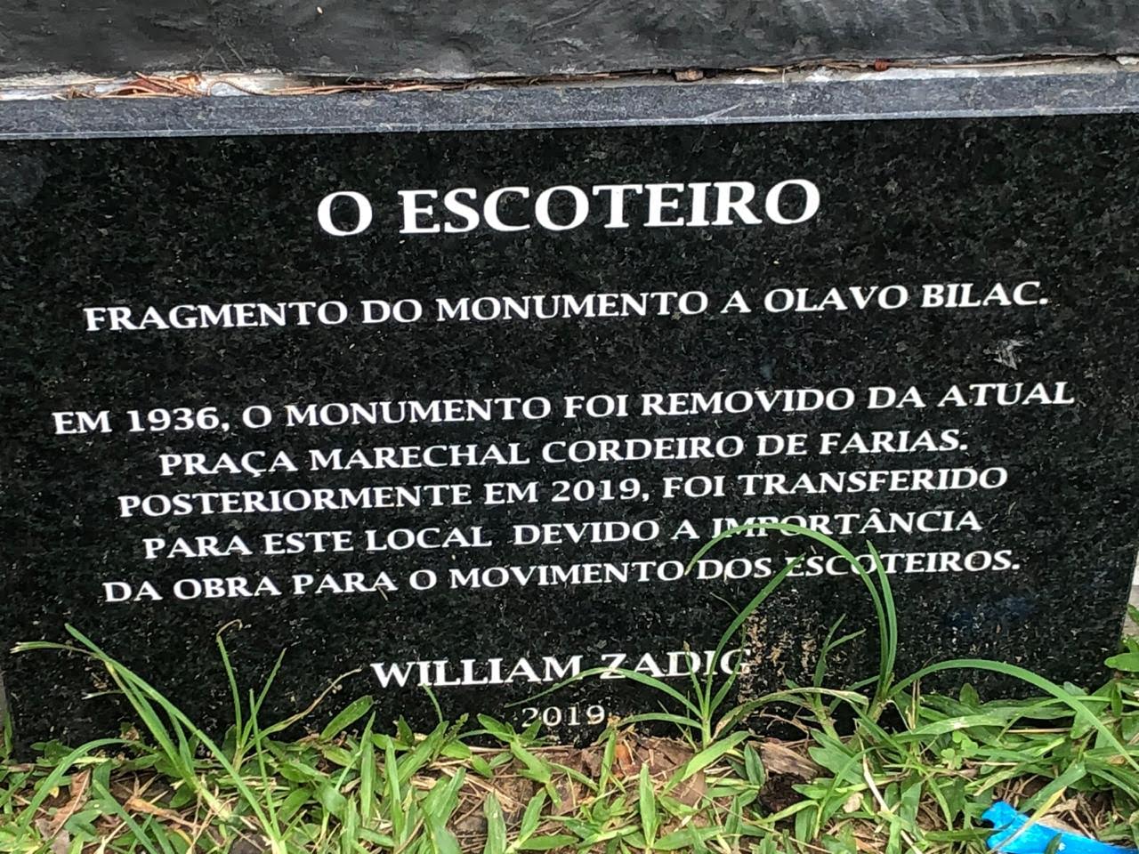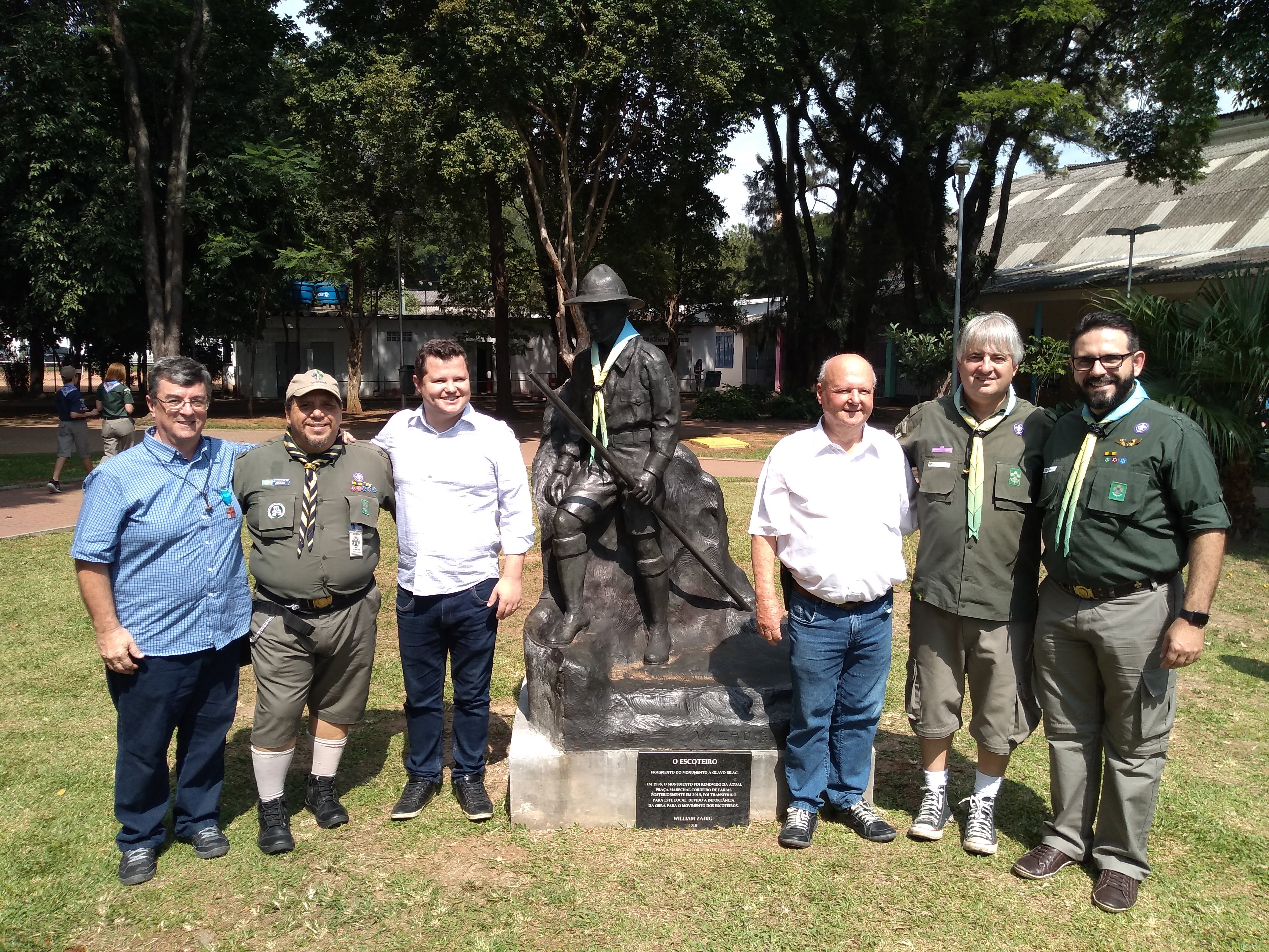 A obra do escultor William Zadig havia sido removida na década de 1930 de seu local original. Após residir por muitos anos em um depósito municipal, foi transferida para o novo local graças a um projeto dos Escoteiros do Brasil – Região de São Paulo, idealizado em 2010/2011 por Benedito Antonio Pilli Junior e Paulo Silva Nhemetz, e que contou para sua efetivação com o apoio parlamentar do vereador Gilson Barreto, do Departamento do Patrimônio Histórico da Secretaria Municipal de Cultura na restauração da obra e da Secretaria Municipal de Esportes e Lazer de São Paulo, que resolveu por acolher a estátua no Centro Esportivo Tietê, devido sua importância para o Escotismo no município.