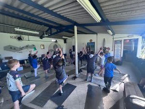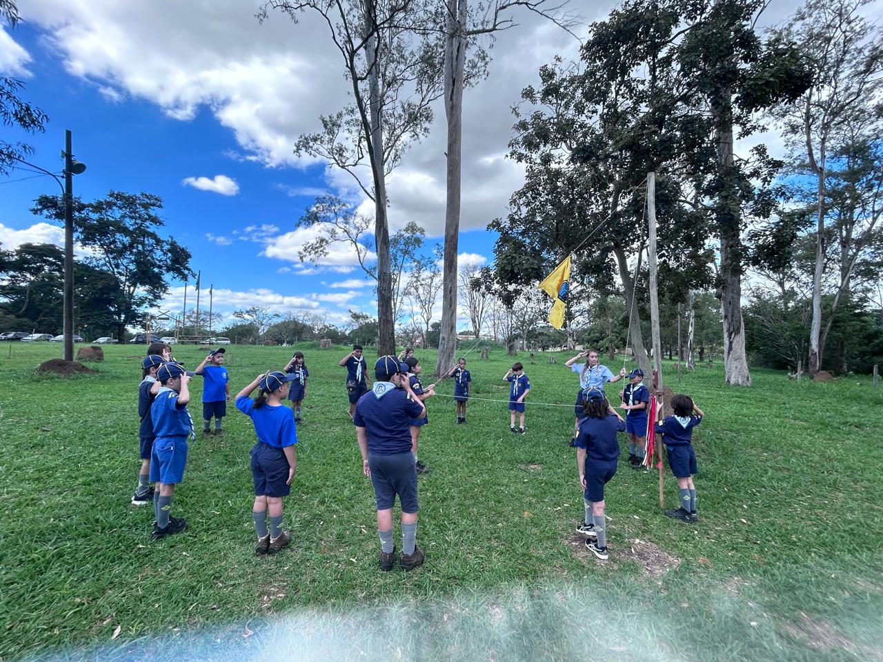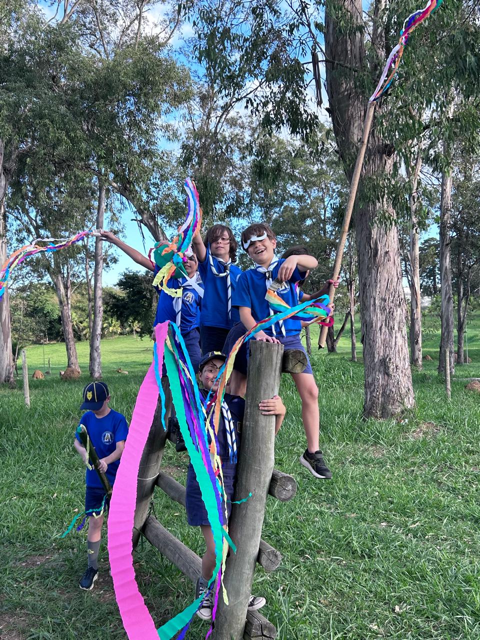 Já a Tropa Escoteira Harpia desenvolveu uma atividade prática com pioneirias, na qual os próprios jovens construíram uma grande estrutura em formato de estrela utilizando bambu e amarrações. O desafio foi além da construção: os participantes utilizaram a estrutura de forma dinâmica, deslocando-se sobre ela, exercitando equilíbrio, cooperação e trabalho em equipe em uma atividade criativa e desafiadora.