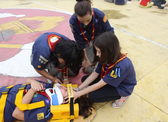 Após uma breve explanação sobre o tema, todos foram encaminhados à quadra externa para o momento mais esperado pelos jovens escoteiros, a prática. Como diz um dos pilares do método escoteiro: “aprender fazendo”. Na prática, os escoteiros puderam exercitar itens valiosos como por exemplo: demonstrar como agir em caso de entorse, fratura e luxação; realizar a imobilização de coluna cervical e utilização de prancha para evitar lesões raquimedulares; demonstrar métodos para transportar 1 (um) paciente sem suspeita de lesão raquimedular e demonstrar como se aplicam ataduras, tipoias e imobilizações na cabeça, tórax, abdômen, braços e pernas.
