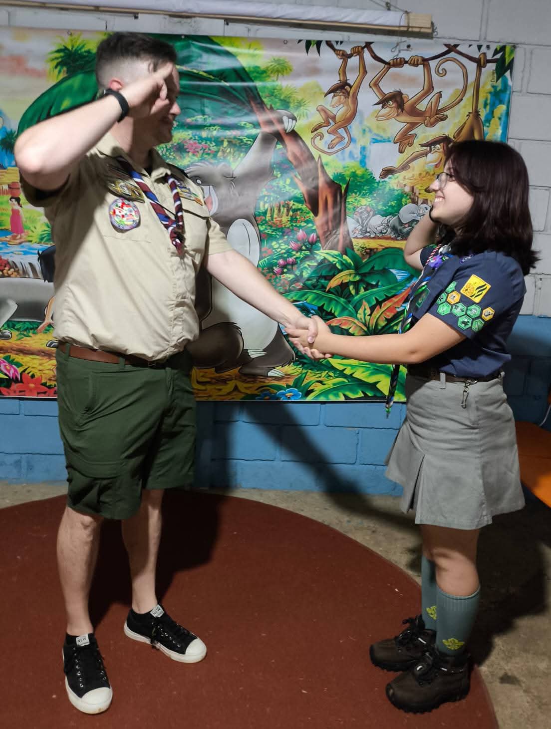 Encerrando a noite, foi realizada uma cerimônia de troca de lenços, um dos momentos mais simbólicos e emocionantes do Escotismo, celebrando o espírito de união e irmandade que ultrapassa fronteiras.
