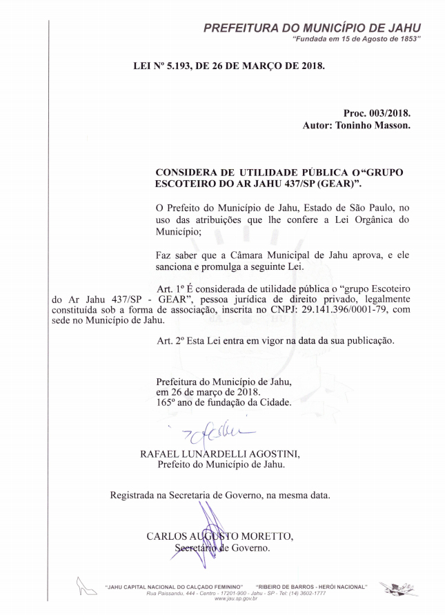 O Grupo Escoteiro do Ar Jahú 437/SP ganhou o reconhecimento de utilidade pública na cidade de Jahu, por meio da Lei 5.193 de 26 de março de 2018. O diretor-presidente do grupo, Daniel Robson Gonçalves, contou um pouco sobre como conseguiram o título. Veja e inspire-se: seu grupo escoteiro pode ser o próximo!