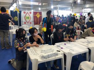 Base 3: Oficina para fazer nó elaborado – Em uma bancada os jovens ensinavam a fazer alguns nós mais elaborados como corrente, e assim os visitantes do stand aprendiam a fazer pulseirinhas e outros adereços com nós.