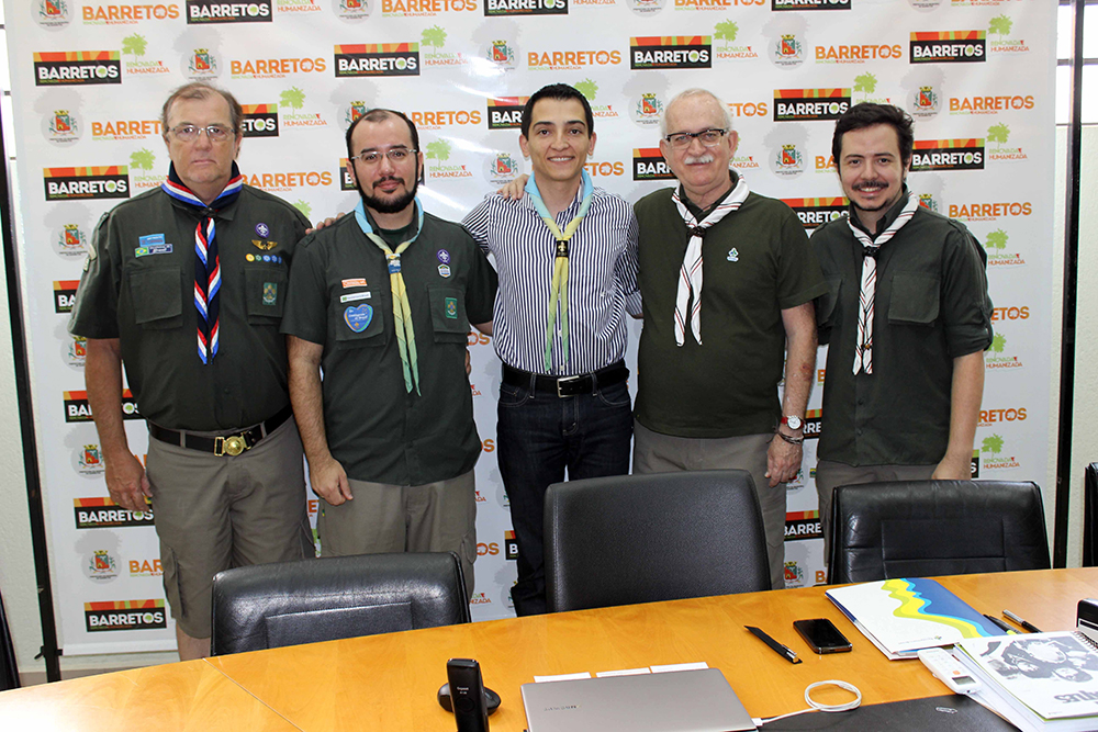 O prefeito Guilherme Ávila recebeu em seu gabinete, no Paço Municipal “Simão Antônio Marques – Librina”, na manhã desta sexta feira, 25 de setembro/15, o presidente da União dos Escoteiros do Brasil, Antônio Lívio Abraços Jorge; o secretário geral, David Ortolan; o secretário regional, Thiago Sampaio e o dirigente do Grupo Escoteiro Chão Preto – Barretos, radialista Wolinsk Maruco, que oficializaram a escolha de Barretos para sediar o 7º Jamboree Nacional Escoteiro, em 2018.