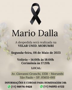 Velório será hoje, dia 08/05 em Av. Giovanni Gronchi, 1358 – Morumbi, São Paulo das 14h às 18h.