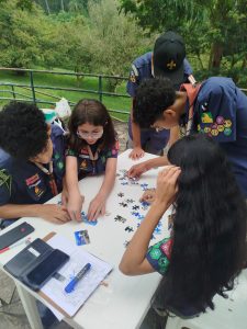 Com a energia lá no alto, cada patrulha partiu para as bases, onde desafios diferentes os esperavam. Na Base “Desvendando a Cultura do Cone Sul”, os escoteiros mergulharam em um caça-palavras temático e montaram um quebra-cabeça que representava toda a riqueza cultural da região. Enquanto isso, na “Expedição Espacial Cone Sul”, foguetes de garrafa PET eram lançados rumo a países demarcados no solo, exigindo precisão e estratégia para acertar o alvo.