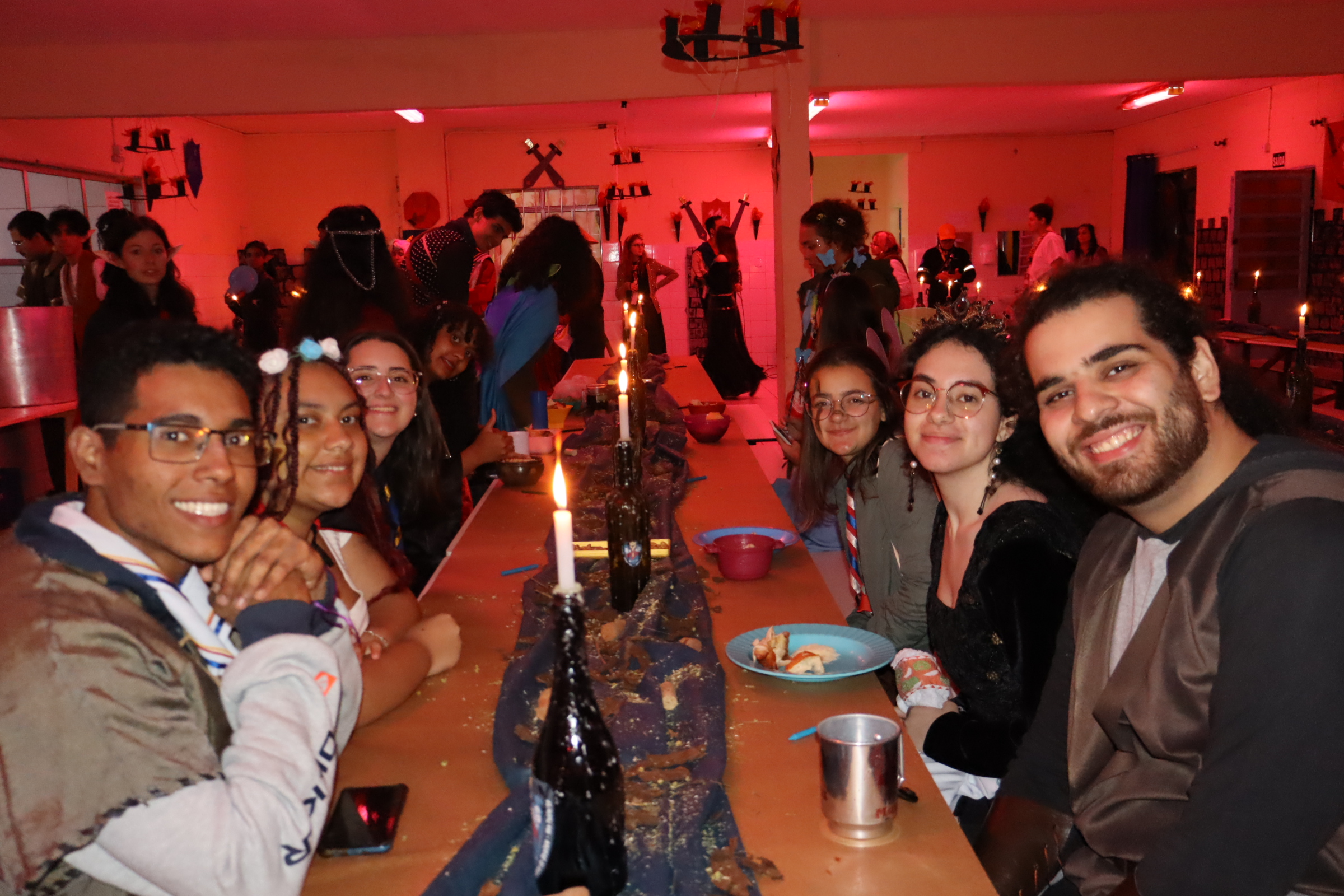 À noite, as luzes da taverna escoteira se acenderam para a grande celebração do Interclãs. A decoração medieval, as músicas temáticas e o espírito dos cavaleiros, druidas e bardos tomaram conta do salão. Os grupos apresentaram performances dos seus personagens e confraternizaram em uma festa recheada de delícias e um baile digno da corte da Rainha de Avalon.