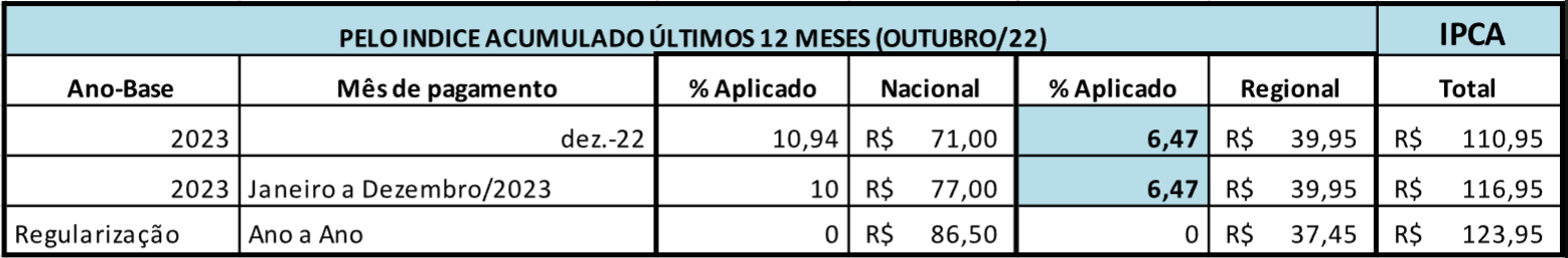 Veja abaixo a tabela de reajuste