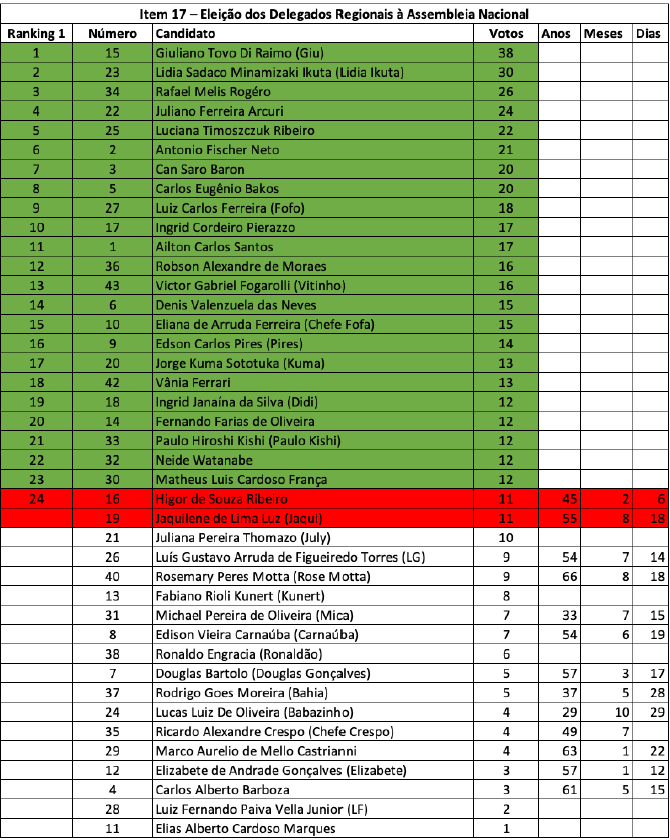 Já para a Comissão Fiscal Regional, os representantes escolhidos foram Denise Nobre de Freitas com 149 votos, Sérgio Corrêa dos Reis com 147 votos e Amândio Mendonça Mendes com 140 votos, enquanto os suplentes são Ricardo Rodrigues com 106 votos e Tiago Vinícius Carneiro Marques com 10 votos.
